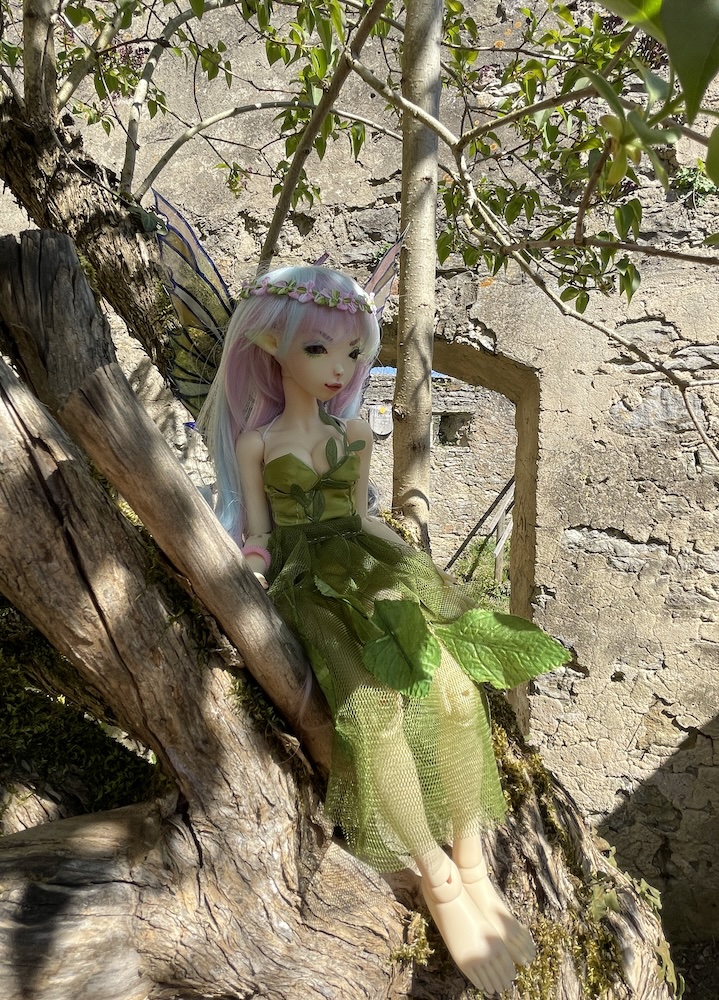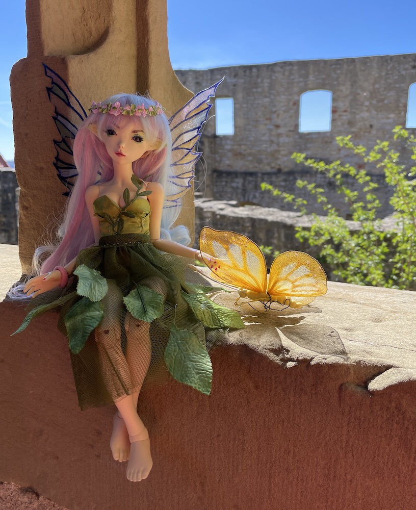 Finally, when we were about to leave, we met Pixie. Pixies are little elvish creatures who like to play tricks on humans – remember Puck from „A Midsummer Night’s Dream“ by W. Shakespeare? So, I suppose we were lucky that she was in a good mood on that day and only threw her little glittery shoes at us to make us pay attention to her. Because, as you can see, she likes to sit high up on beams and trees , so you do not easily notice her.